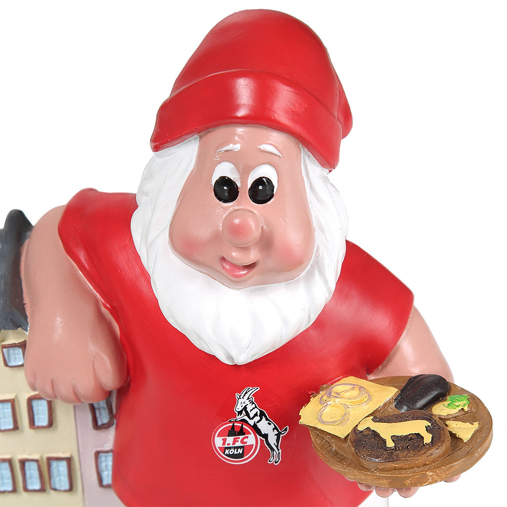 • Gartenzwerg im Fußball-Outfit mit der Kölner Altstadt • Zwerg lehnt lässig an den bunten Altstadthäusern • Der Zwerg hält eine typische kölsche Spezialität in der Hand • Maße: ca. 15,5 x 8 x 16 cm