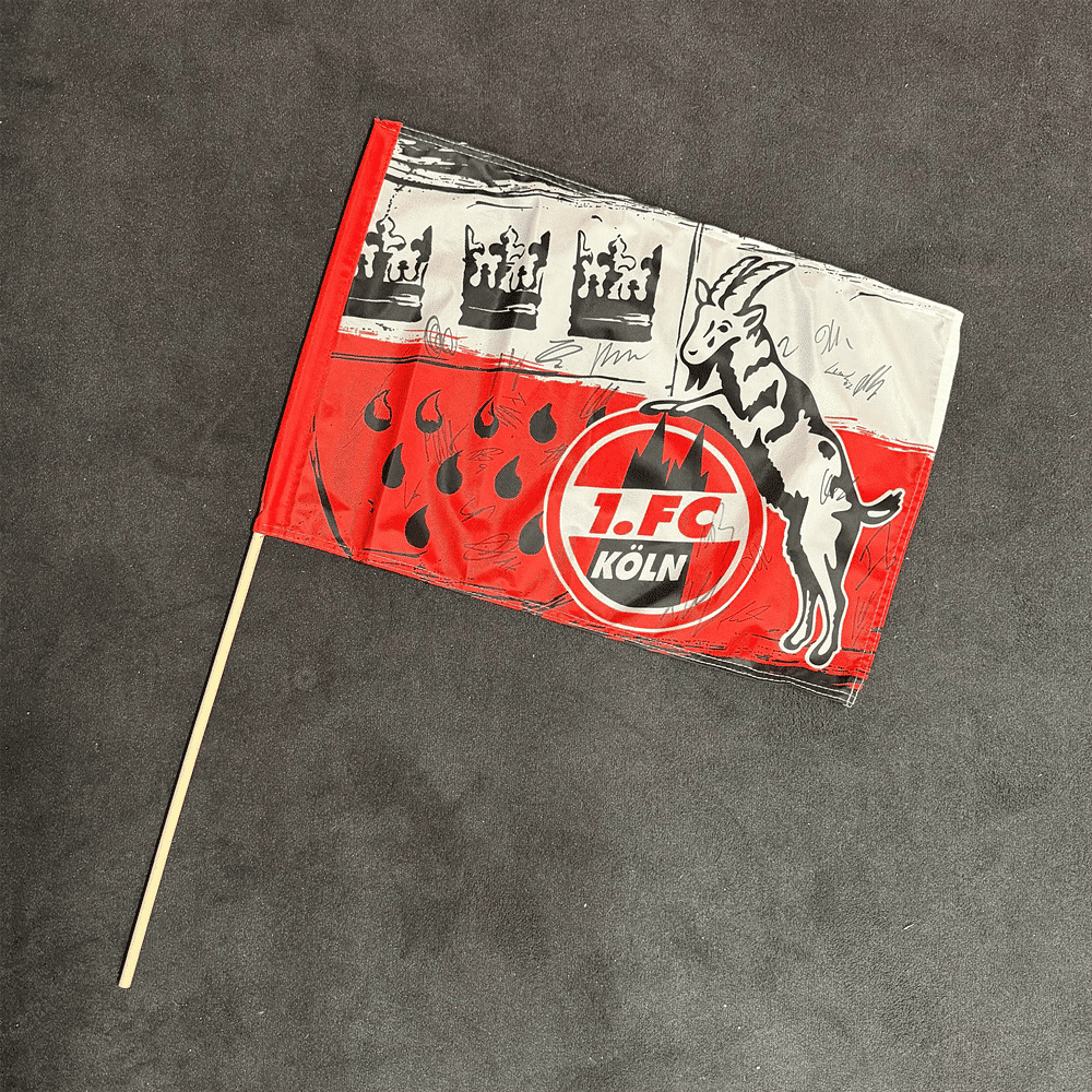 • Signierte Stockfahne mit dem Kölner Stadtwappen und Logo des 1. FC Köln