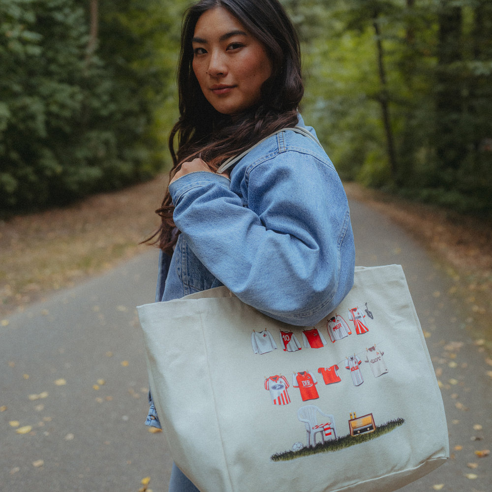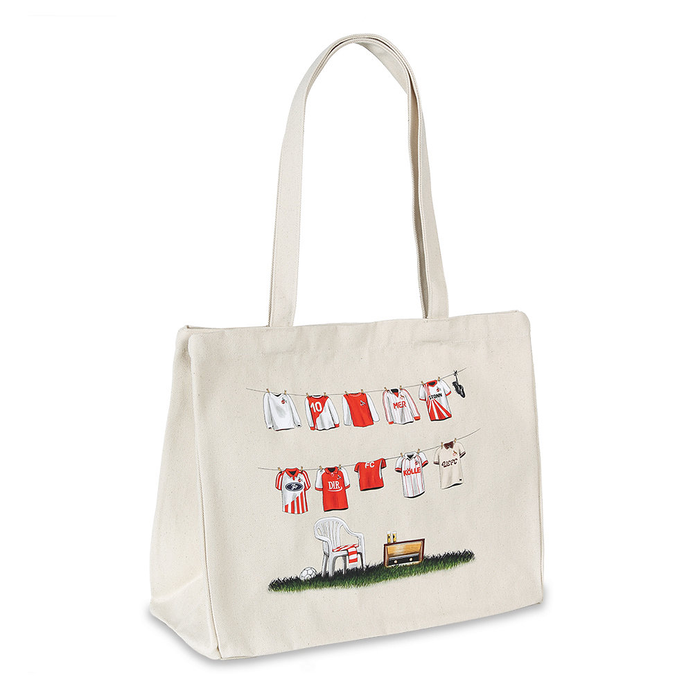 • Großer Print auf der Vorderseite: verschiedenste, legendäre FC-Trikots auf einer Wäscheleine, darunter befindet sich Gartenstuhl, Kölsch, Schal und Radio